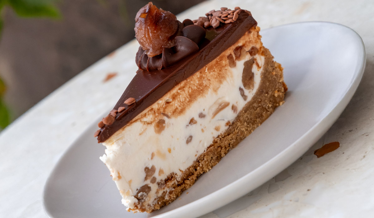 Kestaneli Cheesecake, özellikle Bursa'nın kestane şekerinin şerbetli ve hafif topraksı tadını, çikolatayla kaplı cheesecake'in ipeksi dolgusuyla birleştiren asil bir tatlıdır. Bu, damak zevkini şımartmayı sevenler için mükemmel bir seçimdir. Her bir dilimine denk gelen bir tam kestane şekeri ve dilimler içerisindeki kestane parçacıkları damağınıza hitap eder.